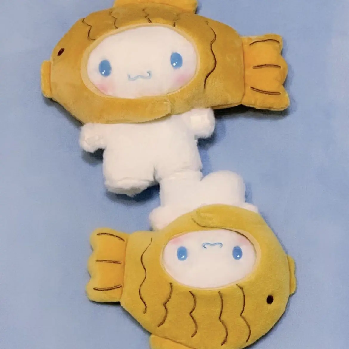 This adorable flannel doll features the beloved Sanrio character, Cinnamoroll, snuggled in a charming fish-shaped costume! A must-have collectible for fans and plush lovers alike