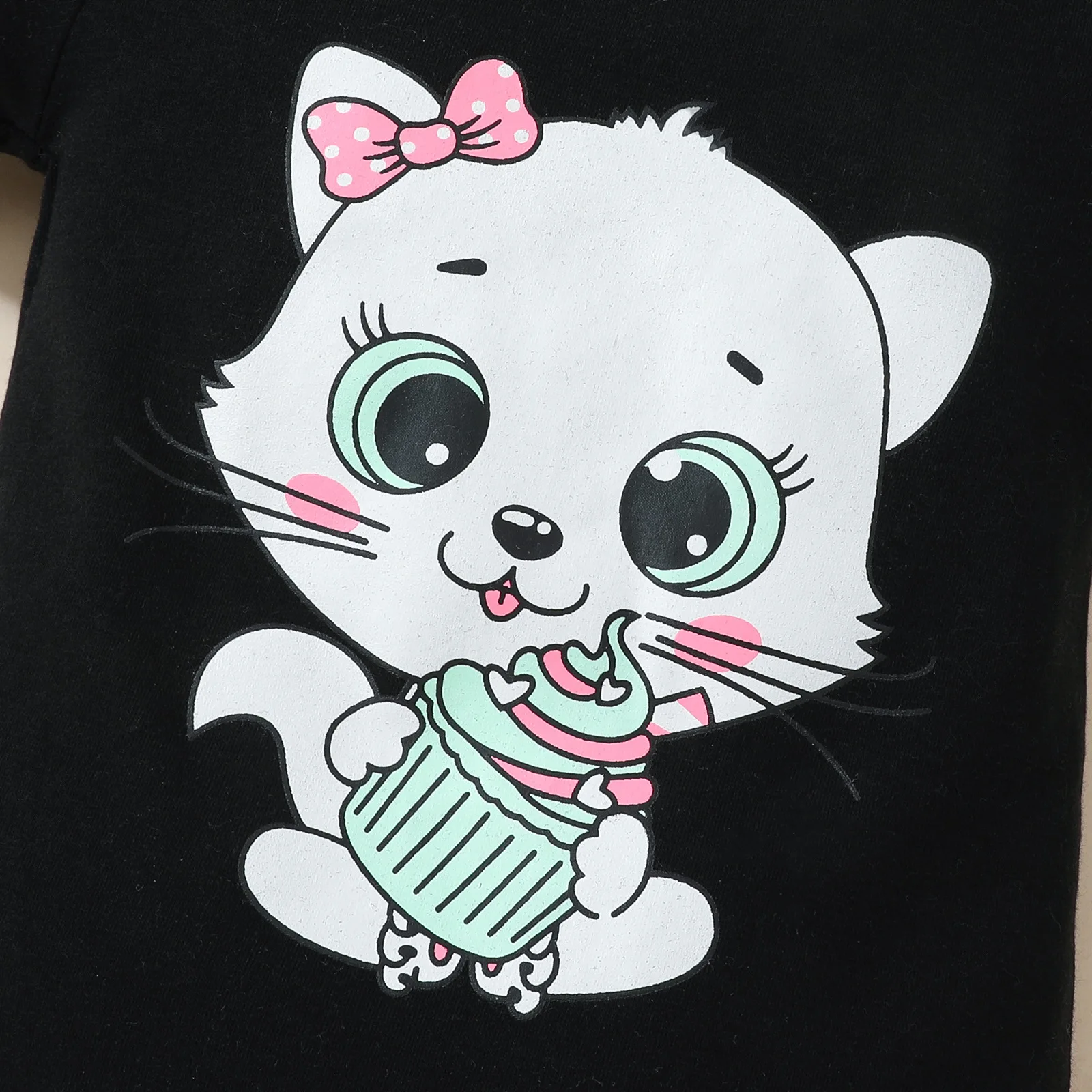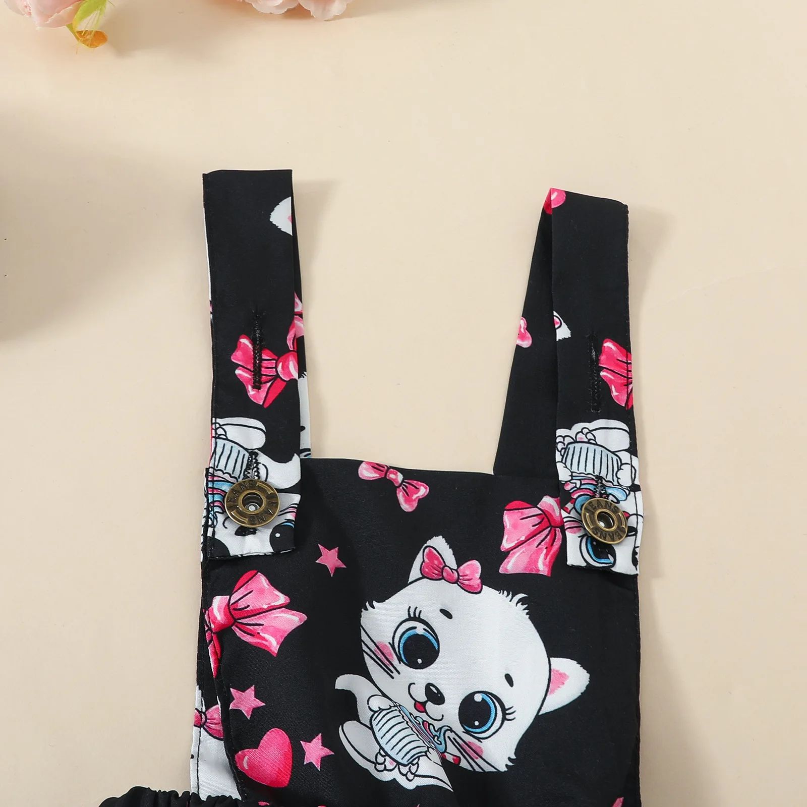 This charming 3-piece set includes a black ruffle-sleeve bodysuit, a suspender dress with an adorable kitten print, and a matching bow headband. Perfect for your little fashionista!