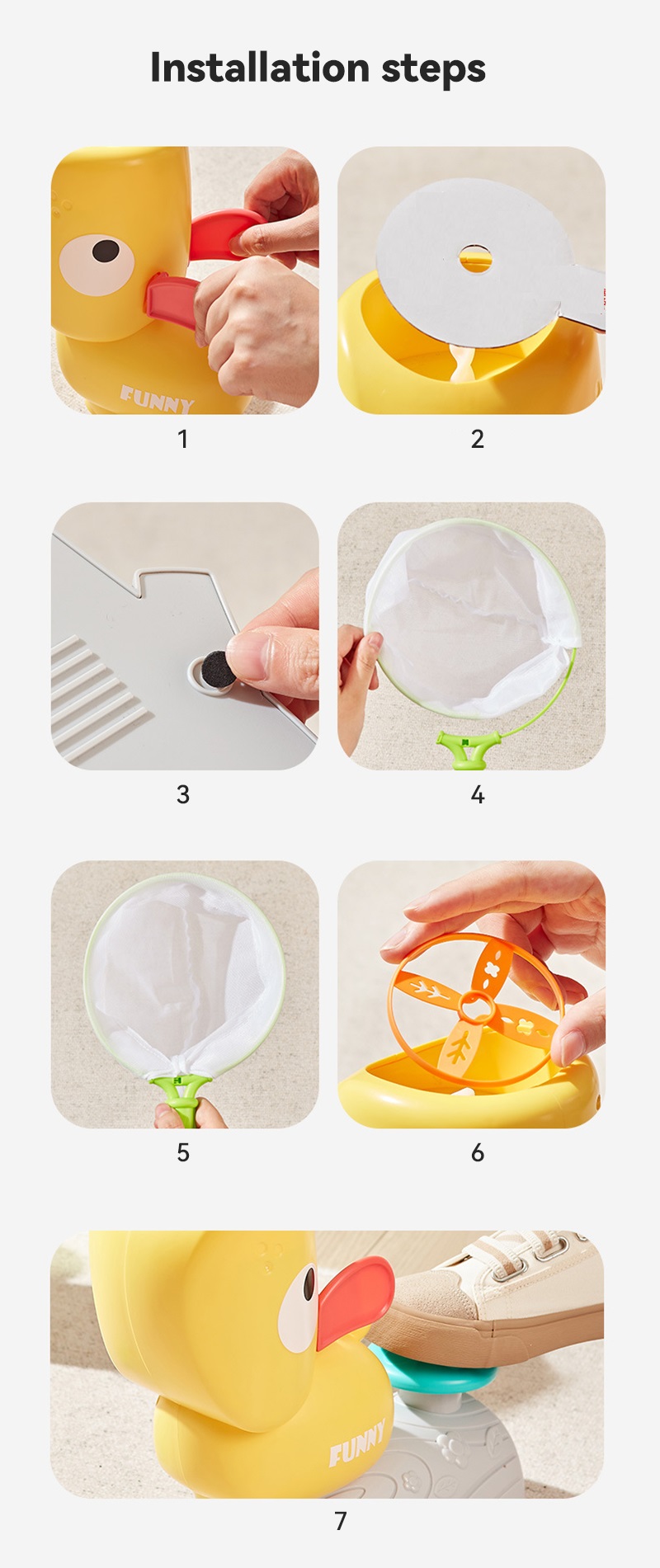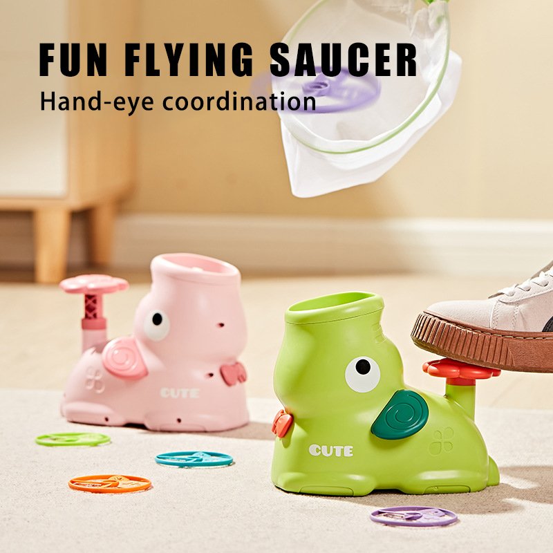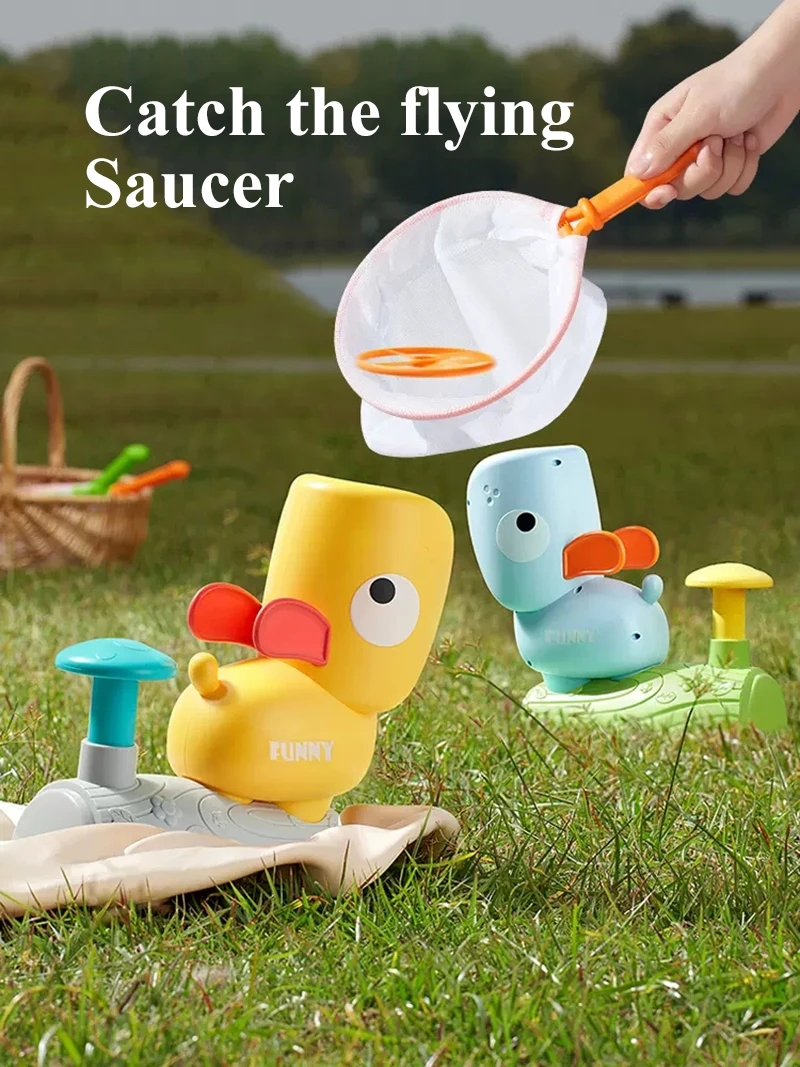 Anyone can control this creative step-on flying saucer toy, it’s perfect for ages 3+ age old to play with each other. Before playing, put on the goggles, insert the discs into the launcher slot, and press the launch button on the outdoor toy. Wait until the discs are in midair before catching them with a net!