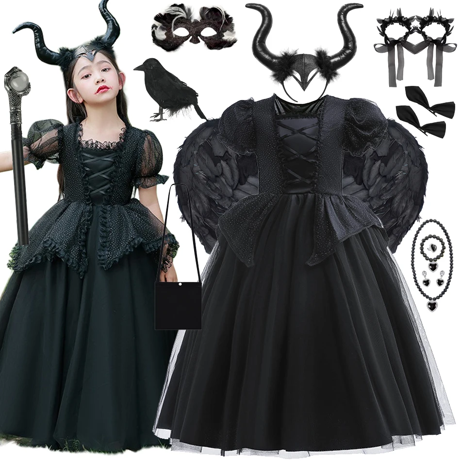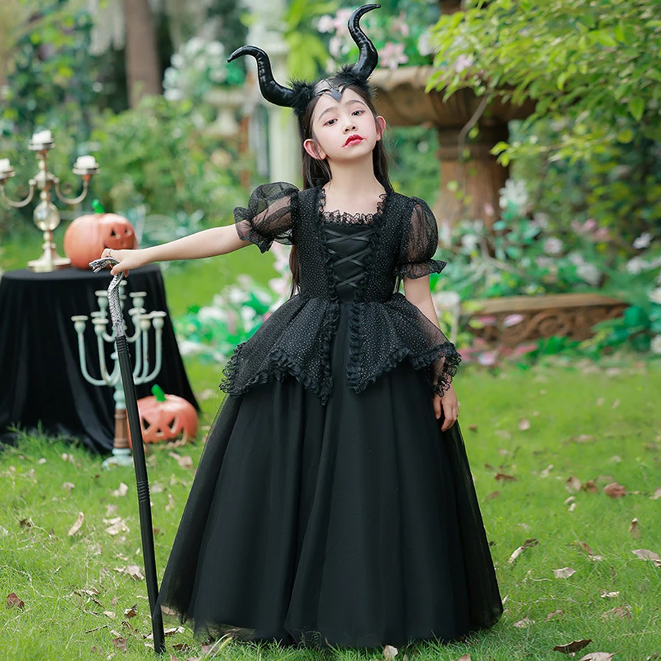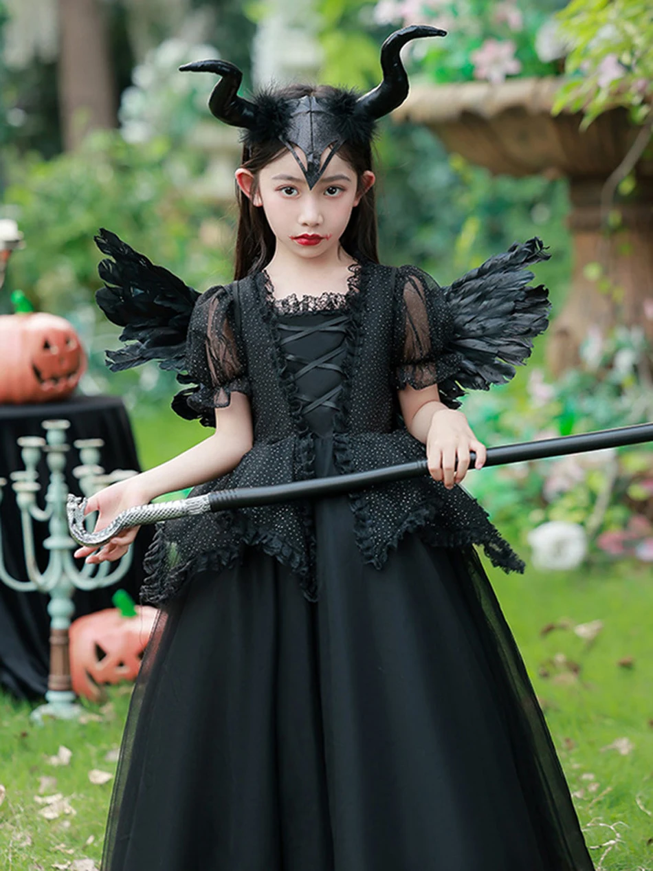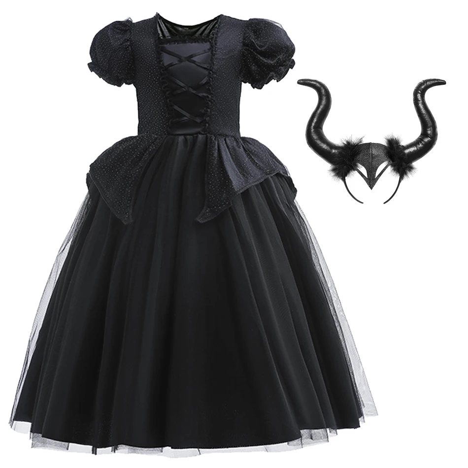 The costume features a long, flowing black gown with intricate detailing, mimicking Maleficent’s iconic look.