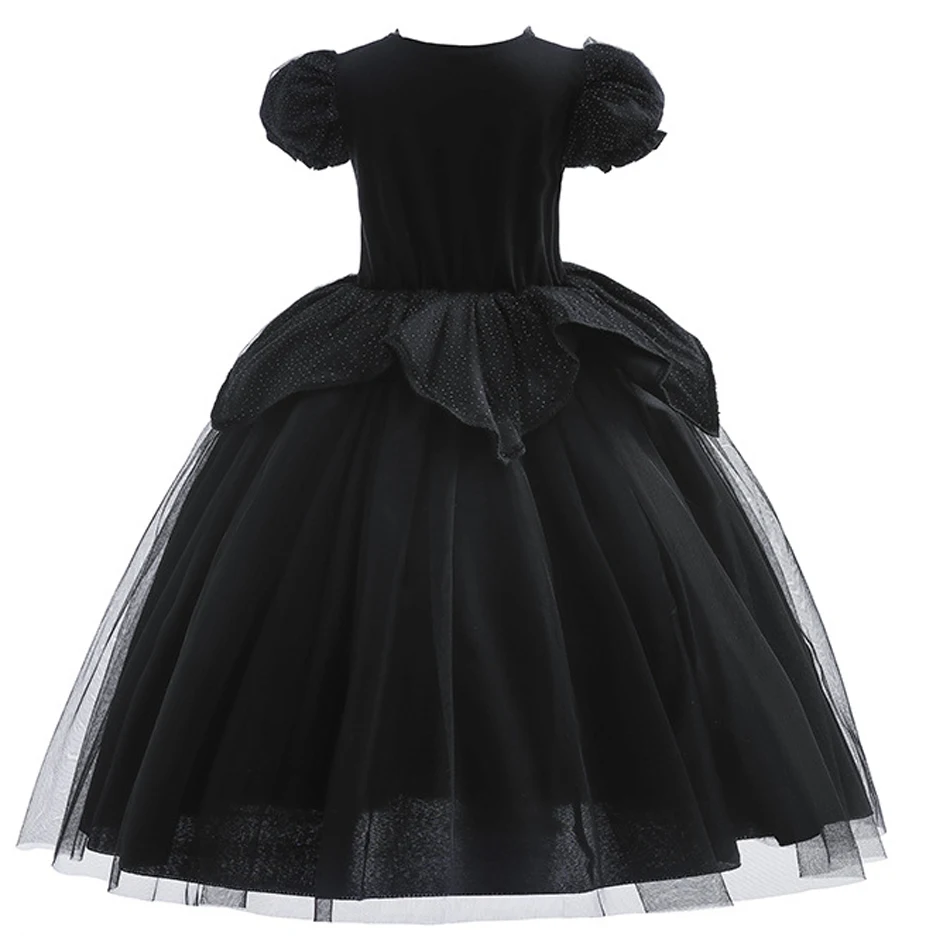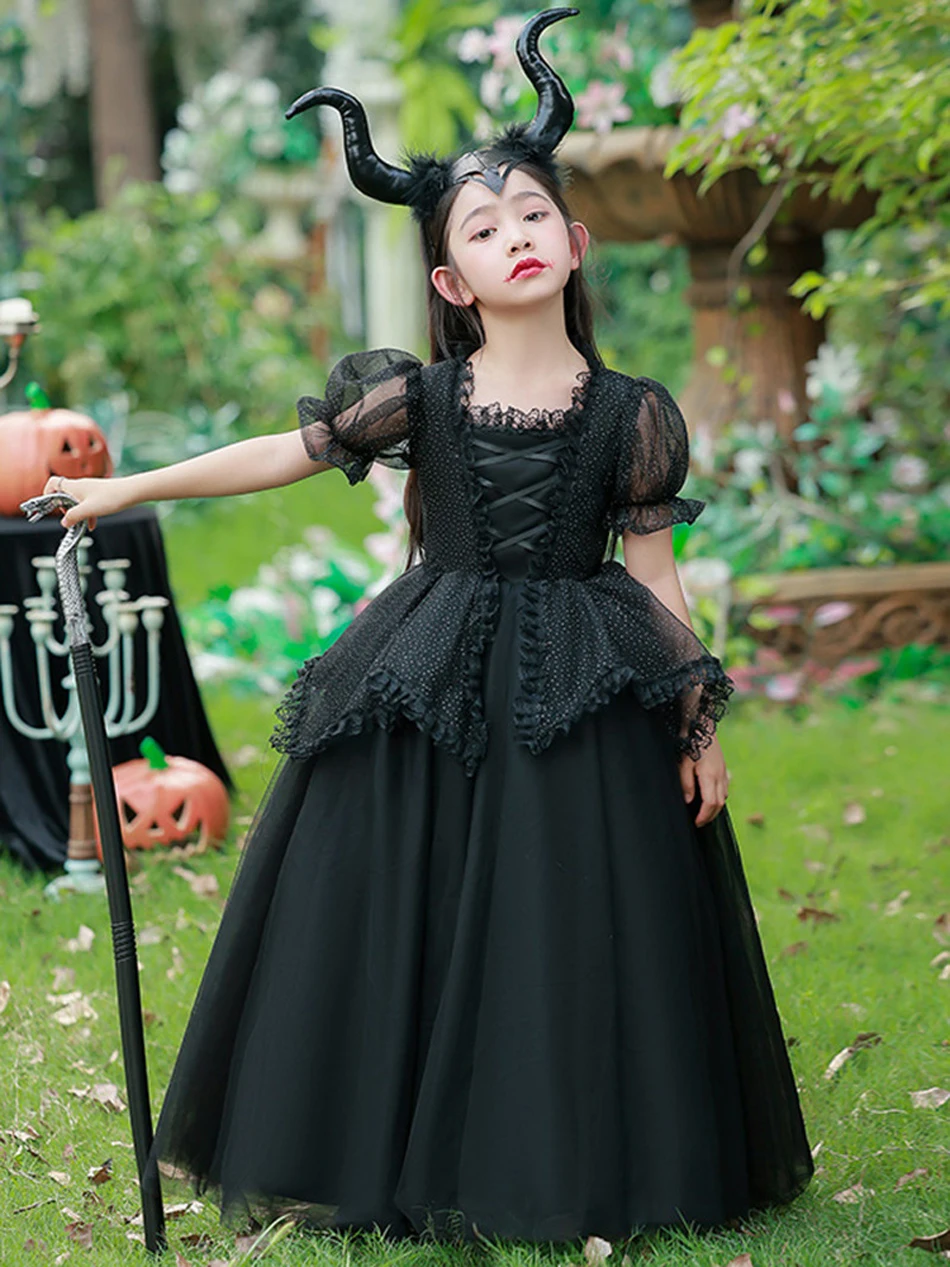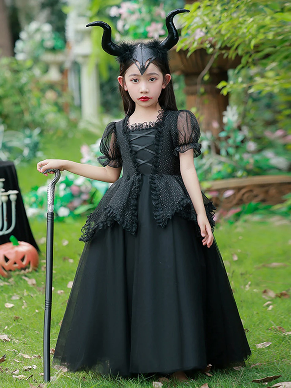 The costume features a long, flowing black gown with intricate detailing, mimicking Maleficent’s iconic look.