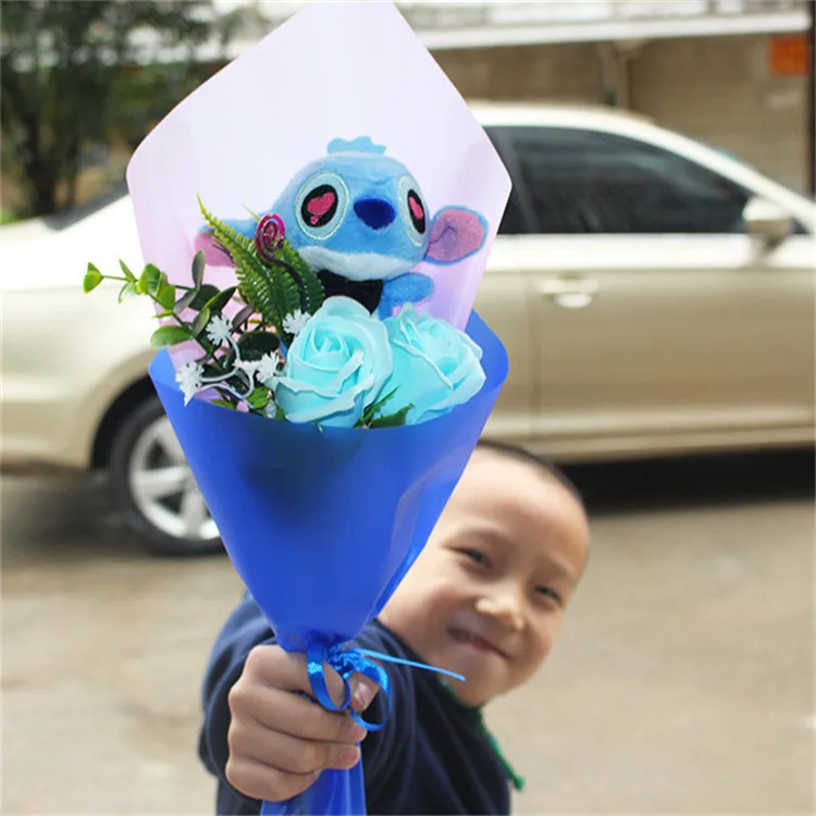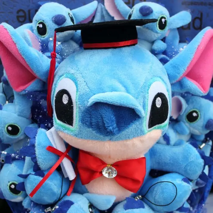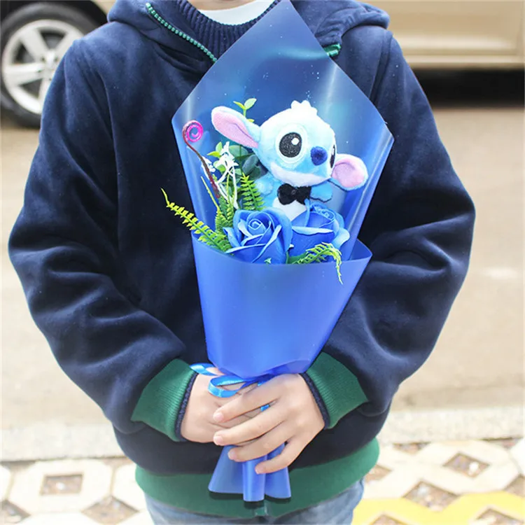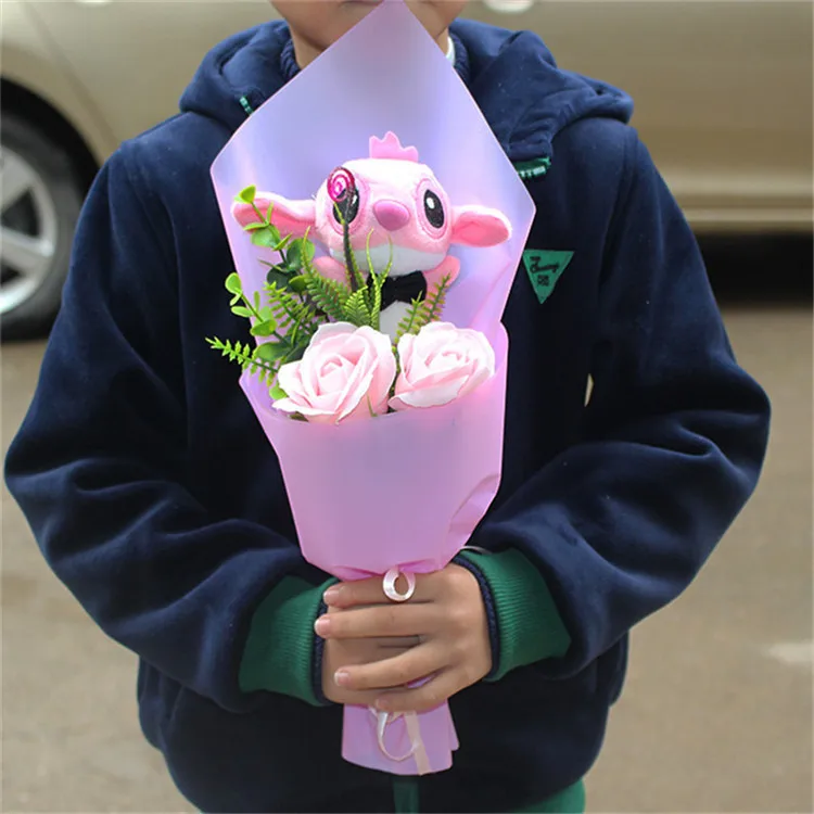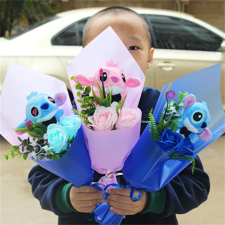 Includes soft, detailed Stitch 💙 and Angela 🌸 plush dolls wrapped beautifully in a bouquet style.